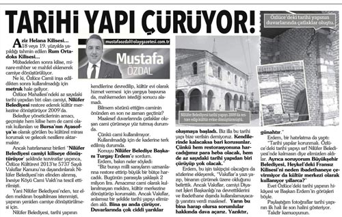 “… Bilmem sözünü ettiğim caminin önünden en son ne zaman geçtiniz? Maalesef duvarlarında çatlaklar oluşan cami çürümeye yüz tutmuş durumda. Çünkü cami kullanılmıyor. Kullanılmadığı için de kaderine terk edilmiş durumda. Konuyu Nilüfer Belediye Başkanı Turgay Erdem’e sordum. Erdem, bakın neler söyledi: