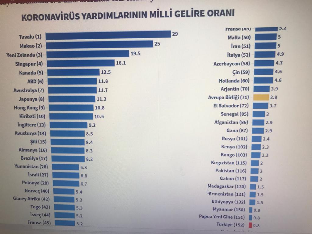 Mesela listenin 26. sırasında yer alan Yunanistan’da milli gelirin yüzde 6,8’i kadar koronavirüs yardımları yapılırken, 51. sırada yer alan İran’da, milli gelirin yüzde 5,1’i kadar yardım söz konusu.