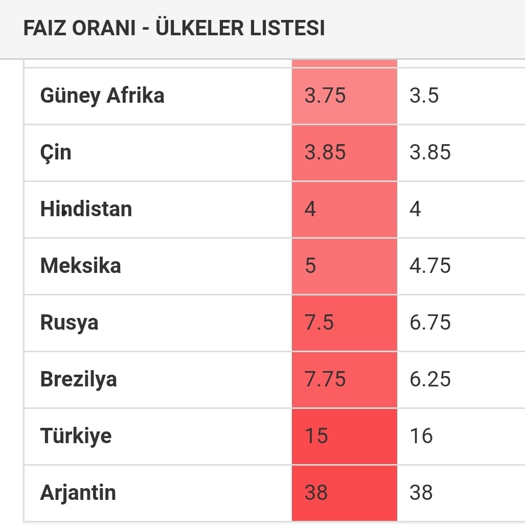 Birinci tablo faiz sıralamasında Türkiye’nin yerini gösteriyor.
