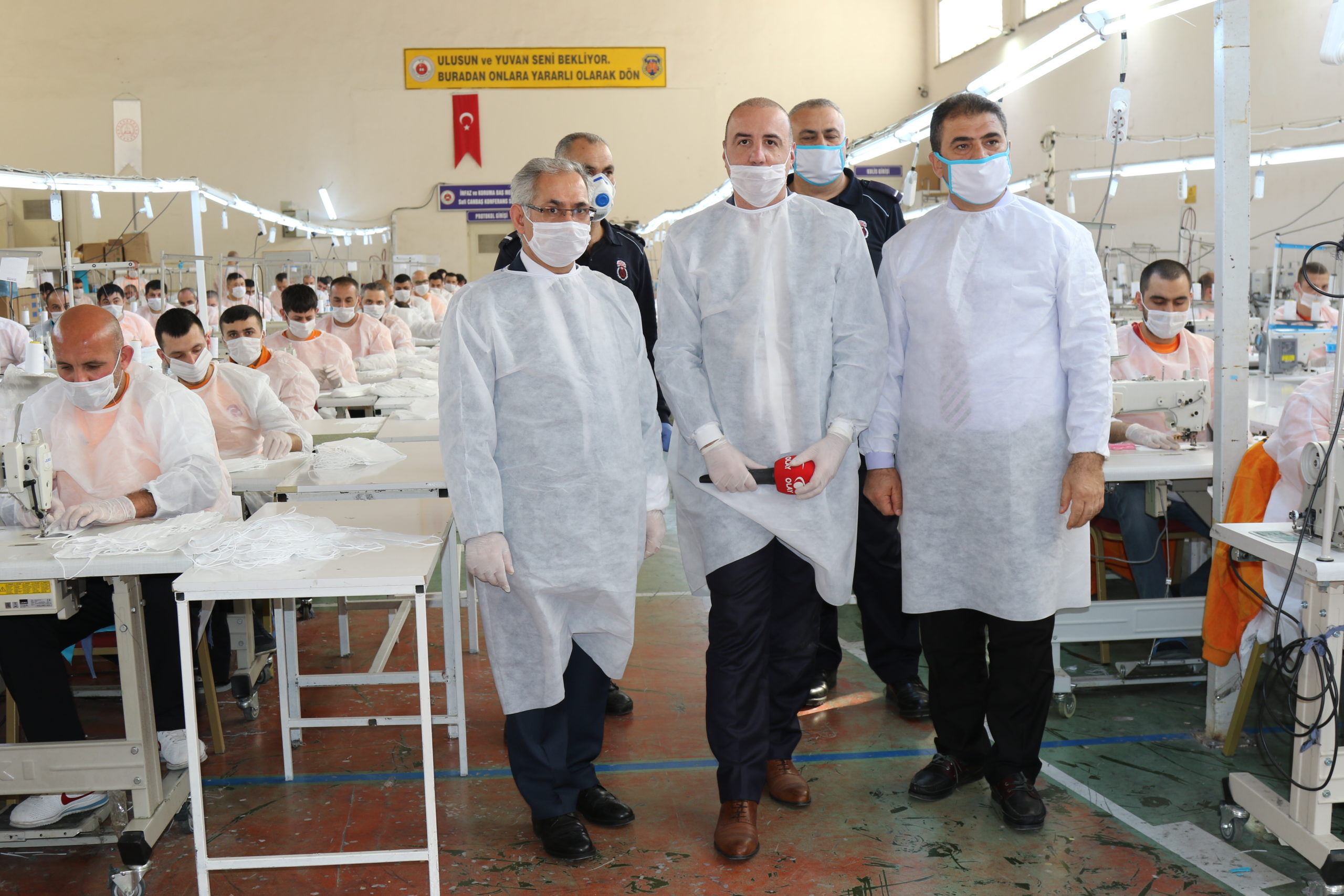Yalçın, “Burası bir ıslah kurumu. Hükümlüler, hem ülke ekonomisine katkıda bulunuyor, hem de meslek ediniyorlar. Günlük 100 bin civarında maske ve 3 bin tıbbi önlük üretiyoruz” dedi.
