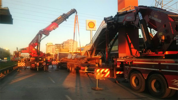 Bu üst geçidin bir ayağı yolu daralttığı için sökülüyor.