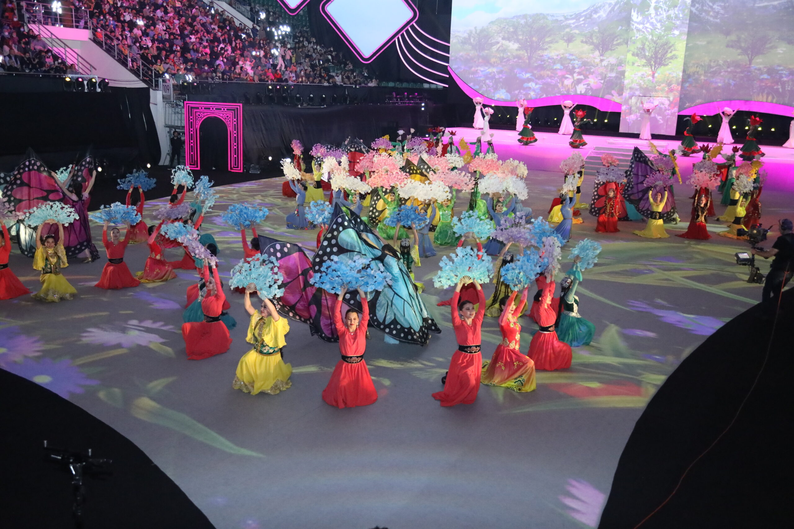 2022 Türk Dünyası Kültür Başkenti açılış konserine ev sahipliği yapan Tofaş Spor Salonu’na girdiğimizde, çekik gözlü kadınlar ve erkekler, kuğuyu andıran kostümleriyle genç kzlar, büyük gösteri öncesi inzivaya çekilmiş develer karşıladı bizi.
