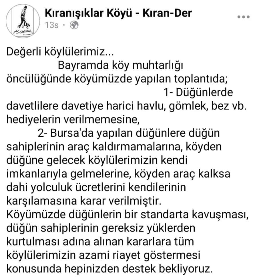 2-Bursa’da yapılan düğünlere düğün sahiplerinin araç kaldırmamalarına, köyden düğüne gelecek köylülerimizin kendi imkanlarıyla gelmelerine, köyden araç kalksa dahi yolculuk ücretlerini kendilerinin karşılamasına karar verilmiştir.