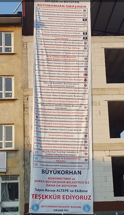 İlçe merkezindeki bir inşaata asılı bez afişte, “Gelişen ve Büyüyen Büyükorhan’ sloganıyla, tamamlanan ve süren yatırımlar ile hizmetler sıralanmış.