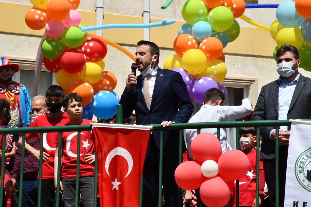 Balkonlarından, pencerelerinden bayram kutlamasını izleyen çocuklar ve yetişkinlere konuşan Kestel Belediye Başkanı Önder Tanır, bu yıl pandemi nedeniyle dünyanın tek çocuk bayramının kutlanamamasına gönüllerinin razı gelmediğini söyleyip, Gazi Mustafa Kemal Atatürk ile aziz şehitleri andı.