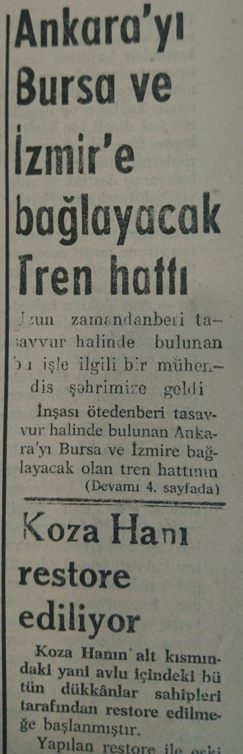‘Ankara’yı Bursa ve İzmir’e bağlayacak tren hattı’ başlığını taşıyan haber, “Uzun zamandan beri tasavvur halinde bulunan bu işle ilgili bir mühendis şehrimize geldi. İnşası öteden beri tasavvur halinde bulunan Ankara’yı Bursa ve İzmir’e bağlayacak olan tren hattının…” ifadeleriyle devam ediyor.