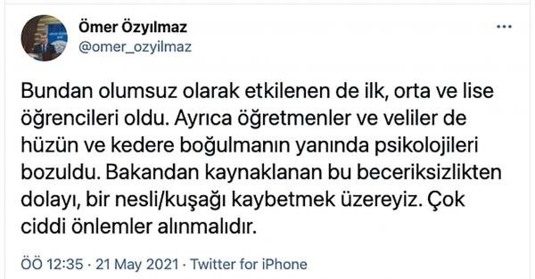 21 Mayıs 2021 tarihinde Cumhurbaşkanlığı Eğitim ve Öğretim Politikaları Üyesi Prof. Dr. Ömer Özyılmaz, sosyal medya hesabından Bakan Selçuk ile ilgili sert bir açıklama yapmıştı.