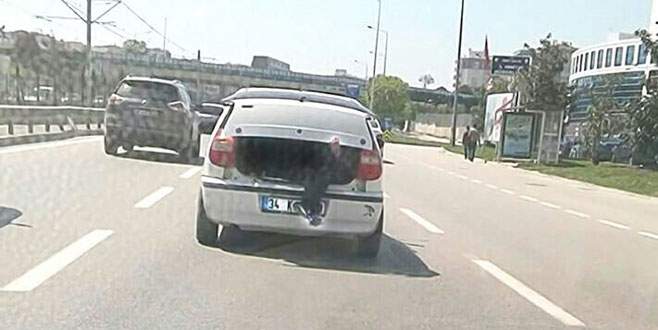 Bursa-İzmir Yolu‘nda İstanbul plakalı bir araç, bagajı açık bir şekilde seyrediyor.
