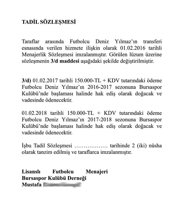 Peki menajeri… Yüzde 10’luk hak edişi 3,5 yıl için toplam 1 milyon 175 bin lira gibi bir rakam yapıyor… Bursaspor kendisiyle 500 bin liraya anlaşıyor… Bunun 200 bin lirasını ödüyor… Geriye kalan sezonlar da fotoğrafta gördüğünüz belgede yazıyor…