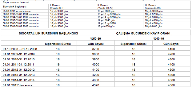 İlk defa sigortalı olduğu tarihten önce malûl (yüzde 60 ve fazlası) olduğu için malullük aylığı bağlanmayanlar, çalışma gücü kaybı yüzde 40 ila yüzde 59 arasında olanlar 1 Ekim 2008 tarihinden sonra tahsis talebinde bulunmaları durumunda aşağıdaki şartlarda 4/b sigortalılığı kapsamına konulan özürlü emekliliğinden aşağıdaki tablodaki şartlarla yararlanabilecekler.
