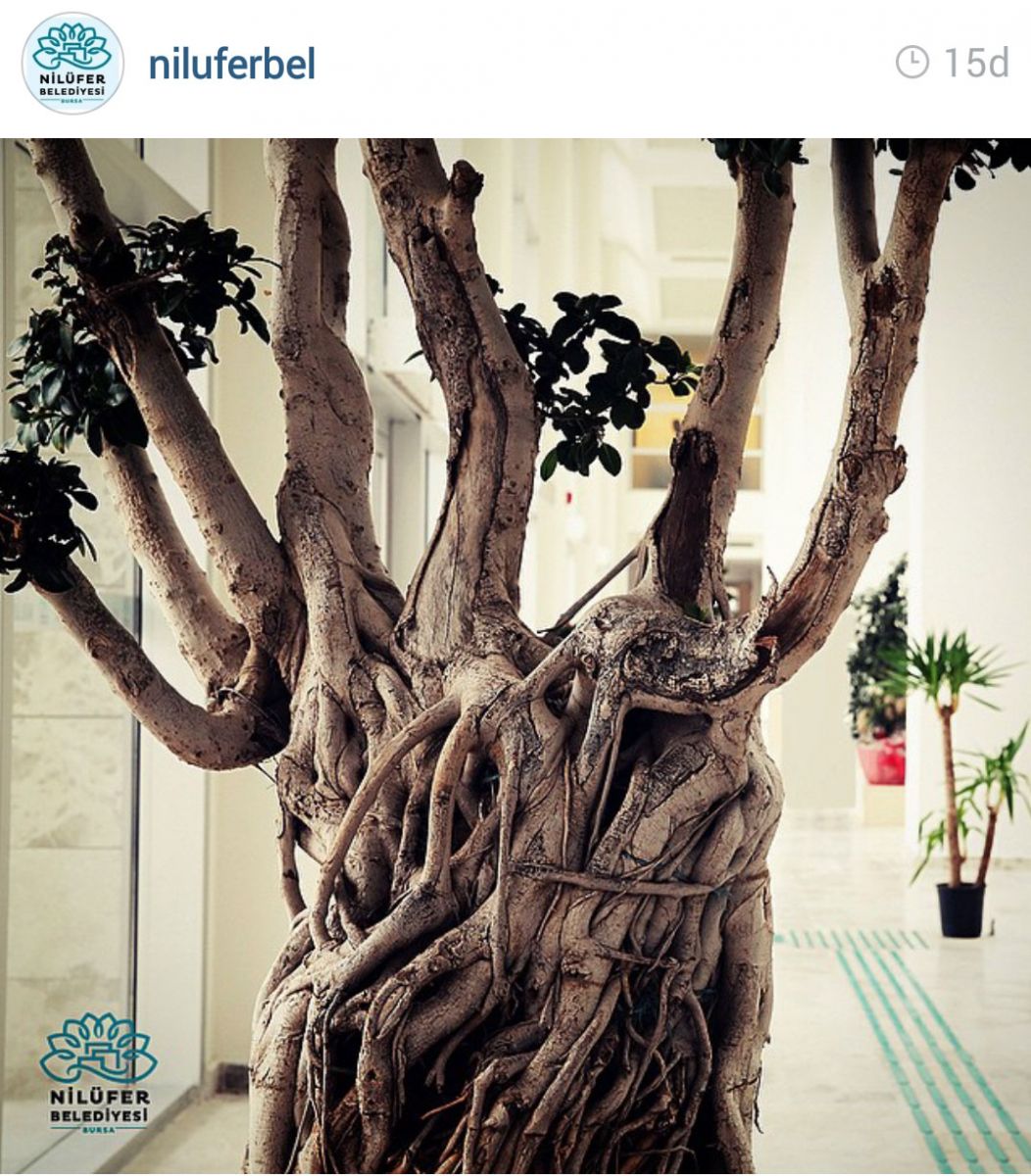 Nilüfer Belediyesi’nin yeni hizmet binasının girişindeki bu ağaç, belediye gelip gidenlerin oldukça dikkatini çekiyor.