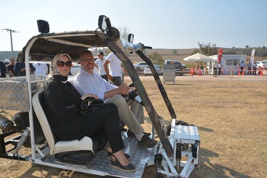 Bol bol barış güvercini uçuran Özkan Başkan, bir ara, eşiyle birlikte Karacabey’li mucitlerin yaptığı yerli otomobile binerek huzur turu atmak istedi.