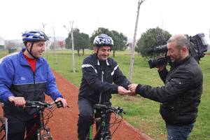 Bir yandan gündemdeki sağlık sorunlarını, yatırımlarını konuşurken, bir yandan da bisikletlere binip, Hüdavendigar Parkı‘nda turlamışlar.
