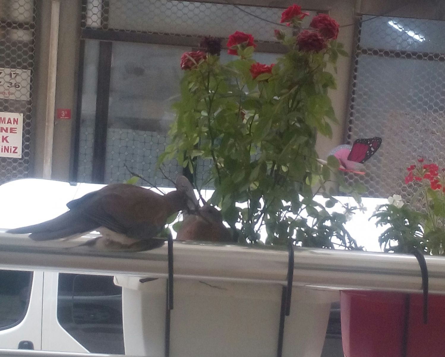 Bir baktım dişisi oturmuş saksının içine, erkeğinin getirdiği çalı çırpıyı yuvasına yerleştiriyordu.