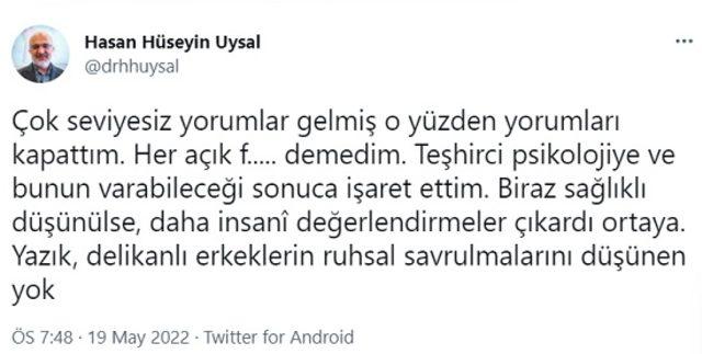 “Çok seviyesiz yorumlar gelmiş o yüzden yorumları kapattım. Her açık f….. demedim. Teşhirci psikolojiye ve bunun varabileceği sonuca işaret ettim. Biraz sağlıklı düşünülse, daha insani değerlendirmeler çıkardı ortaya. Yazık, delikanlı erkeklerin ruhsal savrulmalarını düşünen yok” demiş.