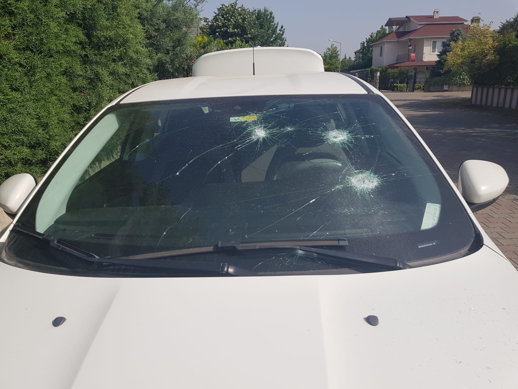 Sabah uyanıp aracının başına gittiğinde otomobilinin taşlı saldırıya uğradığını gördü.