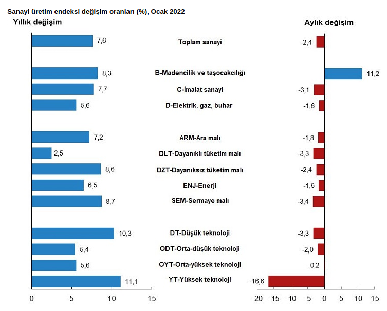 Yıllık bazda yüzde 7,6 artış gösterilirken ocakta bir önceki aya göre yüzde 2,4 daralma yaşandı.