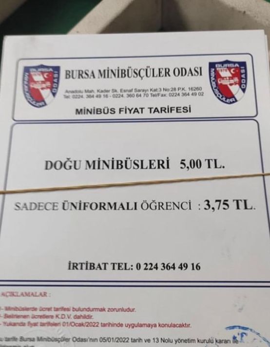 Bursa’da doğu minibüslerinde 4 lira olan tarife 5 liraya öğrenci ücreti ise 3 lira 75 kuruşa yükseltildi.