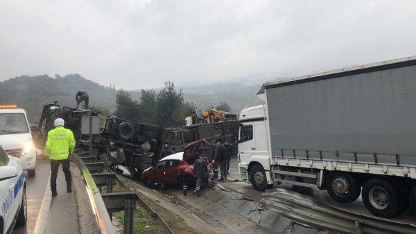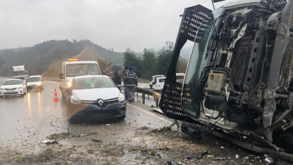 Bursa-İstanbul kara yolunun Dürdane mevkiinde Oyak Renault fabrikasından çıkan sıfır kilometre araçları taşıyan TIR rampadan inerken yan yattı. Kazada TIR sürücüsü kazayı hafif sıyrıklarla atlatırken, TIR’dan düşen sıfır kilometre araçlar kullanılamaz hale geldi.