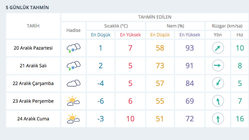 Çarşamba günü ise yağış beklenmiyor. Ancak sıcaklıklarda hissedilir derecede düşüş var. En düşük eksi 4, en yüksek 5