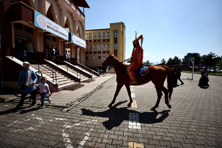 Beyciler Mahallesi’ndeki evinden yeniçeri kıyafetini giyerek çıkan 33 yaşındaki Bişgin, kayıtlı olduğu Beyciler İlkokulu’na atıyla ulaştı.