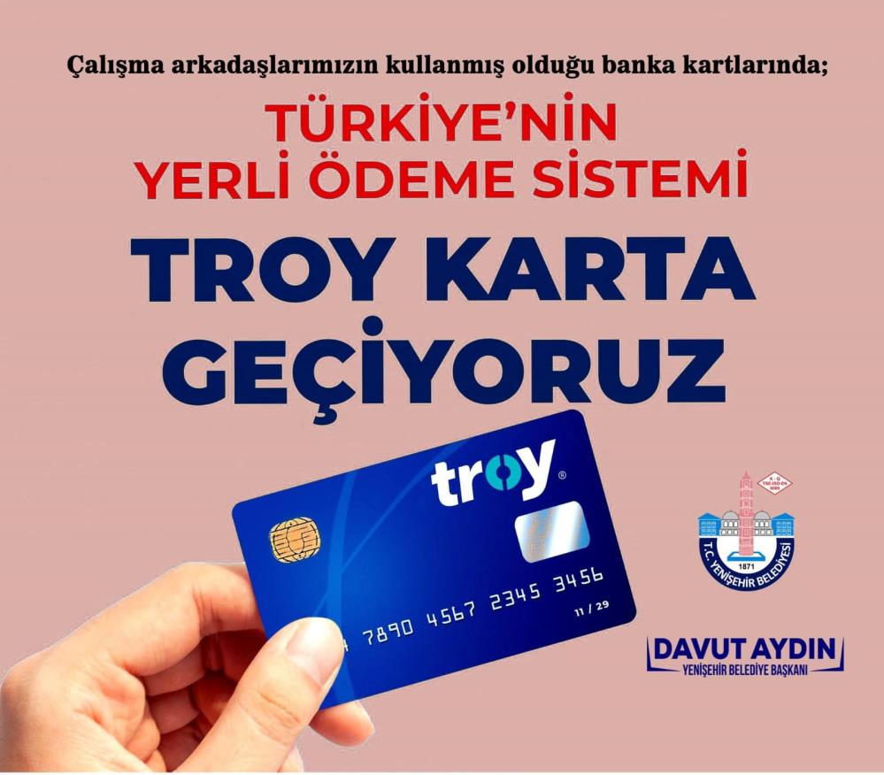 Yenişehir Belediye Başkanı Davut Aydın, “Katil İsrail’i boykot etmek amacıyla tüm belediye çalışanlarımız ve belediyemize bağlı şirket personellerinin maaş kartlarında değişime giderek yerli ve milli ödeme sistemi olan TROY’a geçme kararı aldık. Gereken işlemleri yaptık. Tepkimizi her alanda göstermeye devam edeceğiz” diye konuştu.