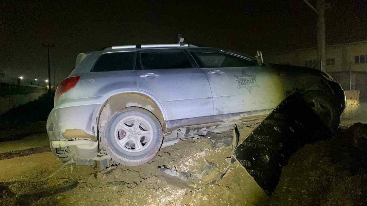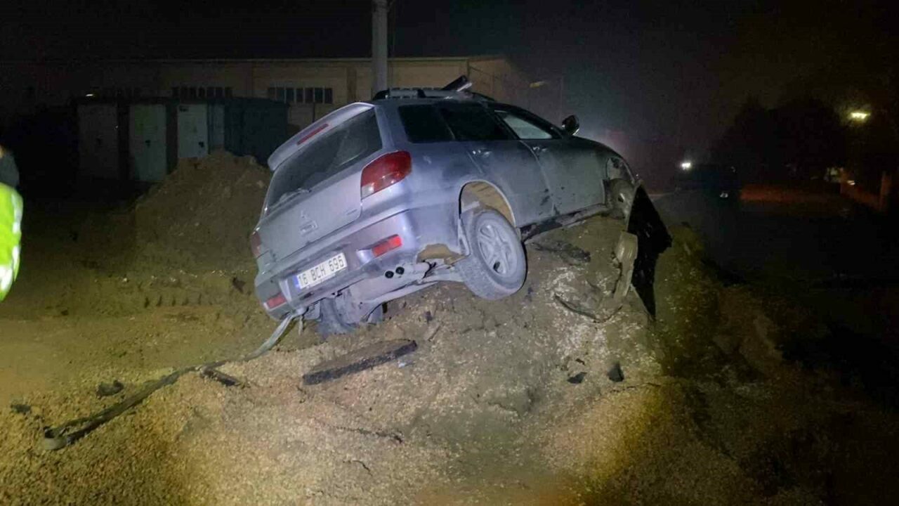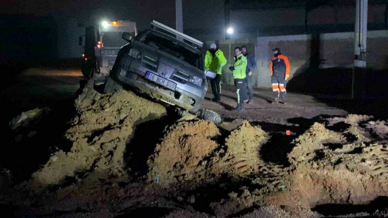 Cadde üzerinde seyir halinde olan İsmail U. yönetimindeki 16 BCH 696 plakalı cip, sürücünün geç fark etmesi sonucu altyapı için kazılan toprağa çarparak saplandı.