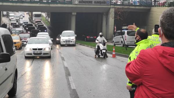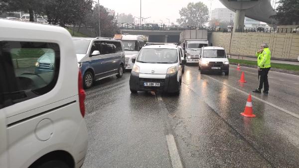 Yağmurun etkisiyle yağ tüm yola yayılınca, sürücüler trafik lambasının da bulunduğu eğimli yoldan çıkamadı.
