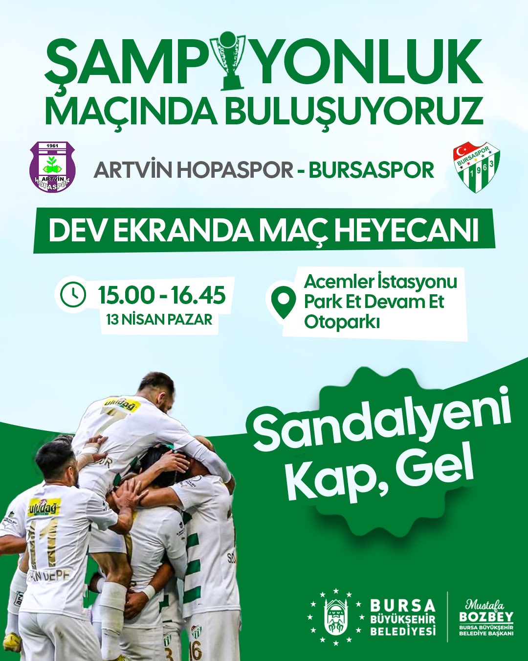 “Bursaspor, pazar günü şampiyonluk maçına çıkıyor. Artvin Hopaspor ile oynanacak maçı, Mütareke Meydanı’nda dev ekranda izliyoruz. Sandalyeni al gel, sen de bu tarihi ana tanıklık et.”