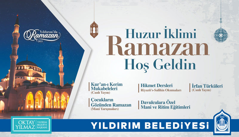 Yıldırım Belediyesi her yıl olduğu gibi bu yıl da Ramazan ayı için çeşitli etkinlikler düzenliyor. “Ramazan Birlikte Güzel” sloganıyla yola çıkan Yıldırım Belediyesi, her yaştan insanın Ramazan’ın manevi ikliminden yararlanmasını amaçlıyor ve bu doğrultuda çalışmalarını sürdürüyor. “Davulculara Adab-ı Muaşeret, Ritm, Mani Eğitimi”, “Hikmet Dersleri- Riyazü’s Salihin Okumaları”, “İrfan Türküleri”, “Çocukların Gözünden Ramazan Mani Yarışması”, Pandemi dolayısıyla “Online Kur’an-ı Kerim ve Mukabele” programları ile birlikte vatandaşlara Osmanlı şerbeti ve lokum ikramları yapılacak.