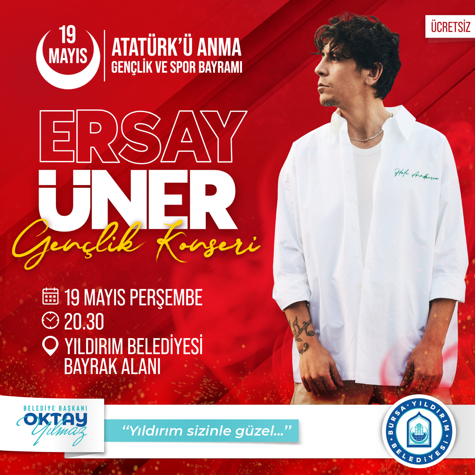 19 Mayıs Atatürk’ü Anma, Gençlik Ve Spor Bayramı coşkusunun doyasıya yaşanacağı konser, 19 Mayıs Perşembe günü saat 20.30’da Yıldırım Belediyesi Bayrak Alanı’nda gerçekleştirilecek. Yıldırım Başkanı Oktay Yılmaz’ın da tüm hazırlıklarıyla yakından ilgilendiği Ersay Üner konseri ile Yıldırım’da rengârenk ve coşku dolu bir atmosfer oluşacak. Gençlik konseriyle ilgili açıklama yapan Yıldırım Belediye Başkanı Oktay Yılmaz, “Ulu Önder Gazi Mustafa Kemal önderliğinde 103 yıl önce Cumhuriyetimizin temellerinin atıldığı bu önemli günde Bayrak Alanı’nda düzenleyeceğimiz Ersay Üner konserine tüm gençlerimizi davet ediyorum” dedi.