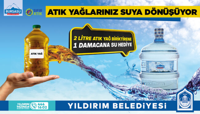 Cumhurbaşkanı Recep Tayyip Erdoğan ve eşi Emine Erdoğan’ın da büyük önem verdiği ve bizzat yönettiği Çevre ve Atık Yönetimi kapsamında yepyeni bir çalışma başlatan Yıldırım Belediyesi, sadece 1 litresi 1 milyon litre içme suyunu kirleten atık yağlardan 2 litre biriktiren hemşehrilerine Bursa Büyükşehir Belediyesi’nin yeni markası Bursa Su’dan 1 damacana hediye edecek.