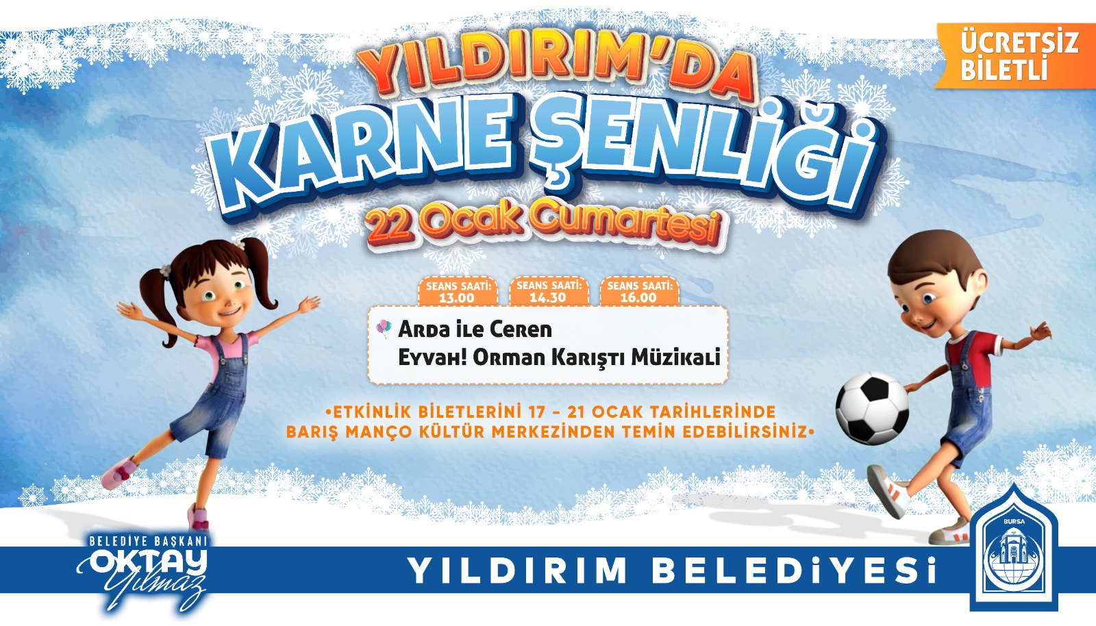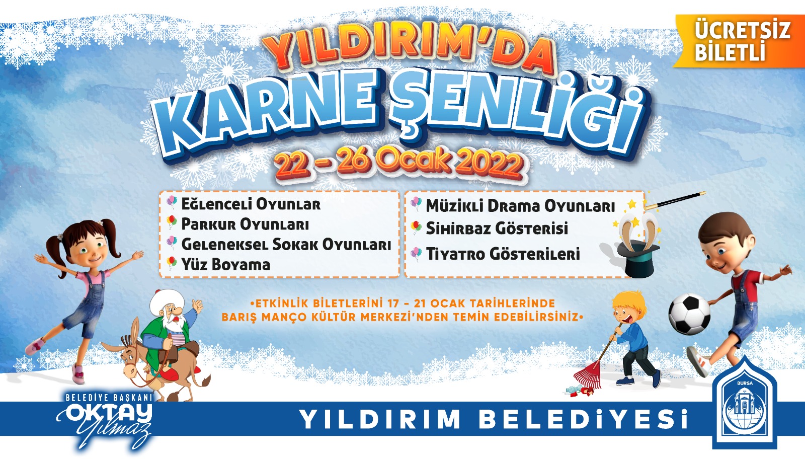 22 Ocak’ta başlayacak olan ‘Yıldırım’da Karne Şenliği’ 26 Ocak’a kadar devam edecek. Eğlenceli oyunlardan geleneksel sokak oyunlarına, yüz boyama etkinliklerinden müzikli drama oyunlarına, çocuk tiyatrolarından sihirbaz gösterilerine kadar çocuklar keyifle vakit geçirecek. 22 Ocak’ta ‘Arda ile Ceren Müzikali’, 23 Ocak’ta ‘Bir Varmış Bir Yokmuş Tiyatrosu’, 24 Ocak’ta ‘Nasreddin Hoca Çocuk Tiyatrosu’, 25 Ocak’ta ‘İbiş ile Memiş Çocuk Tiyatrosu’ Barış Manço Kültür Merkezi’nde gerçekleştirilecek. Öte yandan, 26 Ocak’ta Kaplıkaya Cazibe Merkezi Akvaryumu, öğrencilerin ücretsiz ziyaretine sunulacak. Yoğun bir eğitim-öğretim dönemini geride bırakacak öğrencileri kutlayan Yıldırım Belediye Başkanı Oktay Yılmaz, “Eğitim dönemi boyunca hep yanında ve destekçisi olduğumuz çocuklarımızı sömestr tatilinde de unutmuyoruz. Bu yıl karne şenliğimizde çocuklarımız sömestr tatiline mutlu bir başlangıç yapacaklar. Tüm çocuklarımızı bir dönemin yorgunluğunu atmaları ve eğlenceli anlar geçirmeleri için Yıldırım’da Karne Şenliği’ne bekliyoruz. Vatandaşlarımız, ‘Yıldırım’da Karne Şenliği’ etkinlik biletlerini, 17-21 Ocak tarihleri arasında Barış Manço Kültür Merkezi’nden temin edebilir” dedi.