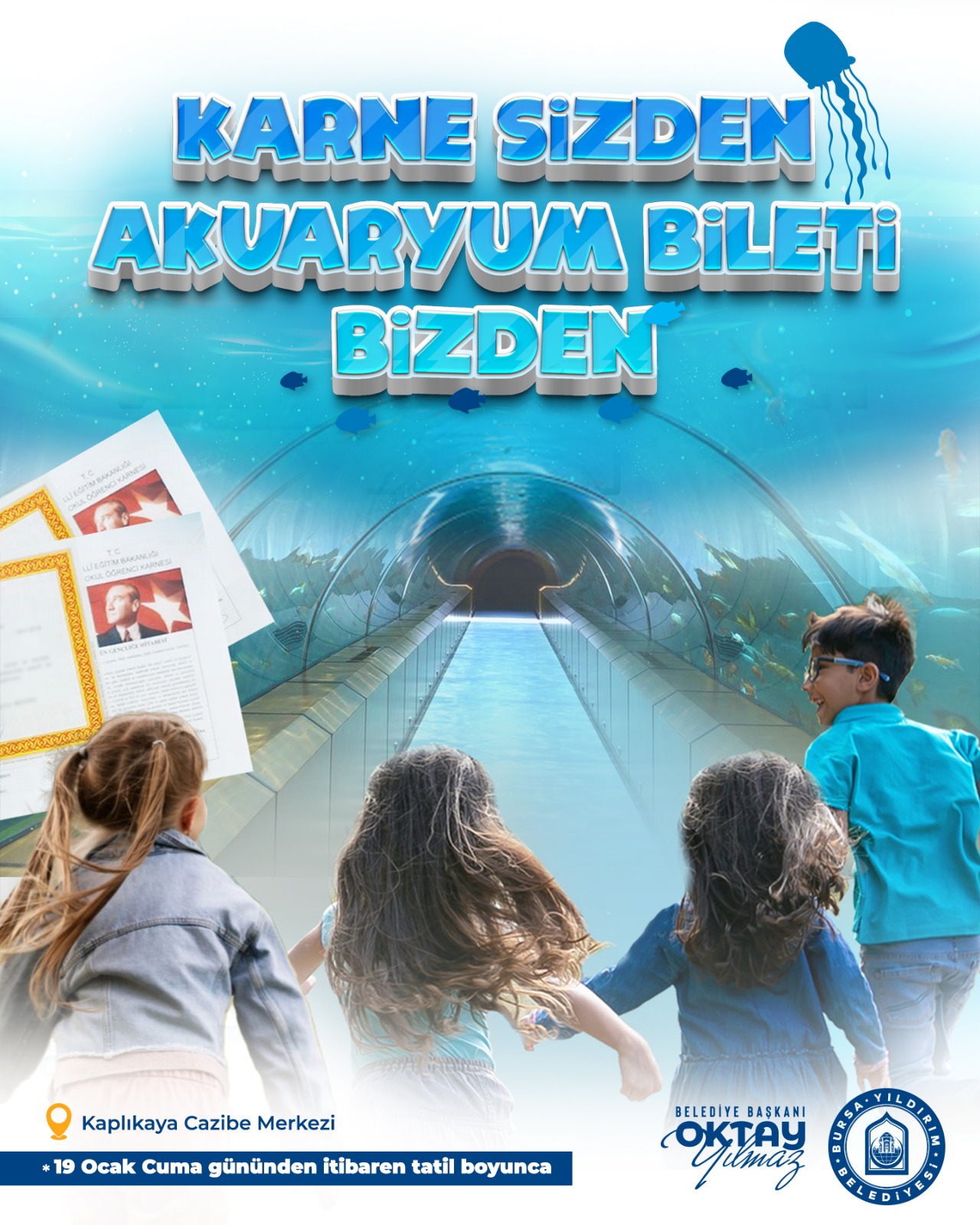 Yıldırım Belediyesi, ‘Karne Sizden Akvaryum Bileti Bizden’ sloganıyla ara tatil boyunca Cazibe Merkezi Tünel Akvaryumu’nu Yıldırımlı çocukların ücretsiz olarak hizmetine sunuyor.
