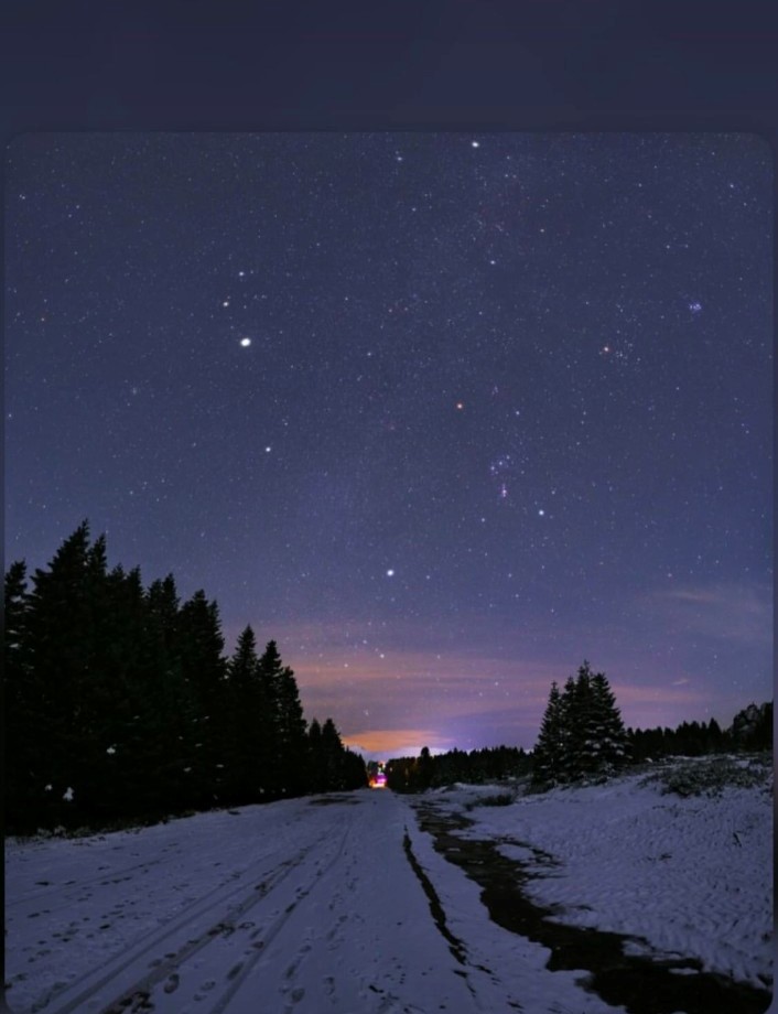 Gökyüzündeki yıldızların altında ve karların üstündeki Uludağ görüntüsü çok etkileyici bir fotoğrafa ustanın imzası olarak yansıyor.