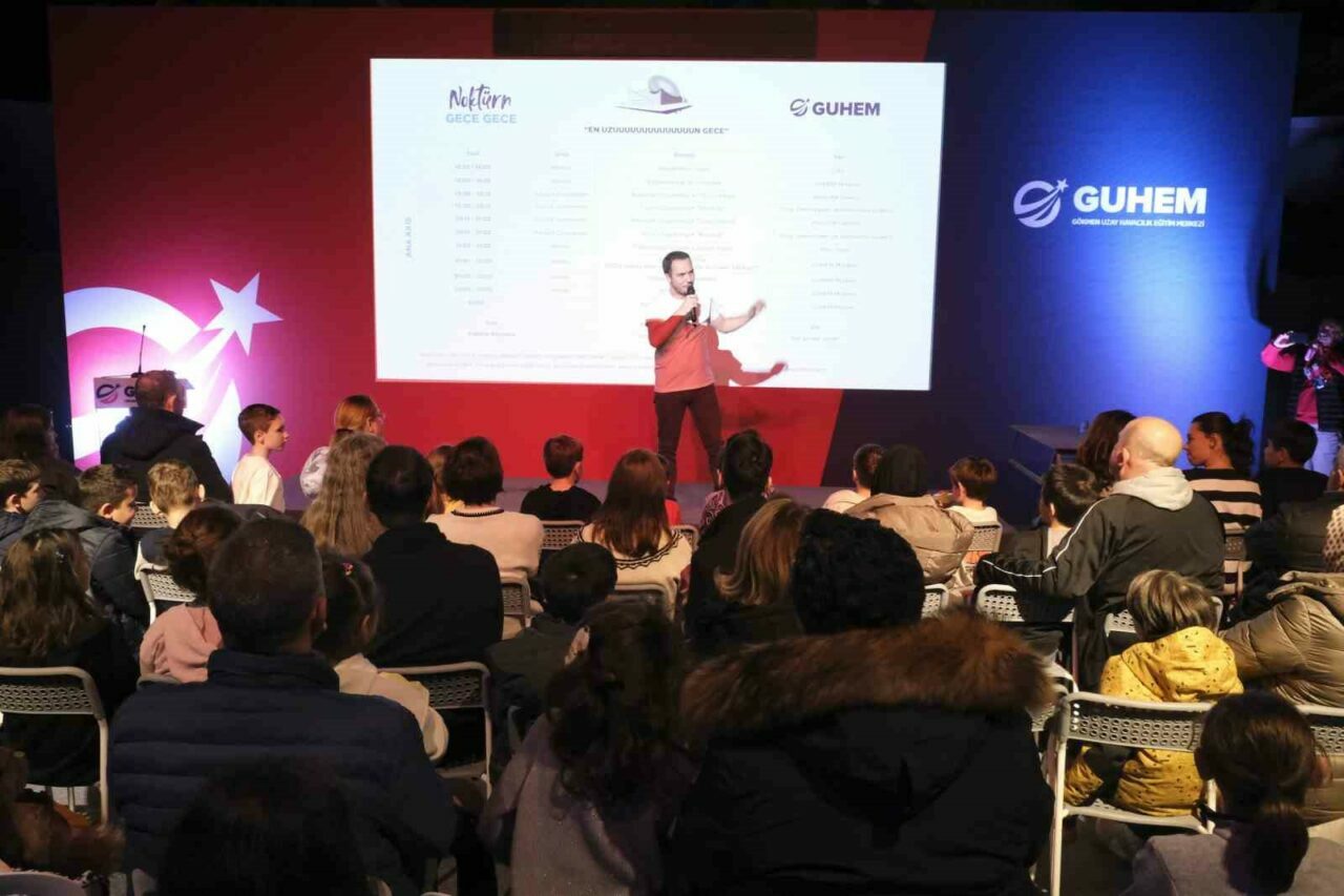 Karanlığın en uzun sürdüğü özel gecede düzenlenen programa onlarca gökyüzü meraklısı bir araya geldi. Gökyüzü meraklılarına benzersiz bir deneyim sunan program kapsamında teleskopla yıldız ve gezegen gözlemi, bilim yarışmaları ve gösteriler, atölye çalışmaları ve ailelerin katılımıyla eğlenceli bir dizi aktiviteler gerçekleştirildi. Türkiye’nin, ‘Milli Uzay Programı’nda da yer alan ve Avrupa’nın en büyük, dünyanın ise ilk 5 merkezi arasında yer alan GUHEM’i ziyaret eden katılımcılar ise etkinlikten büyük bir memnuniyet duyduklarını söyledi.