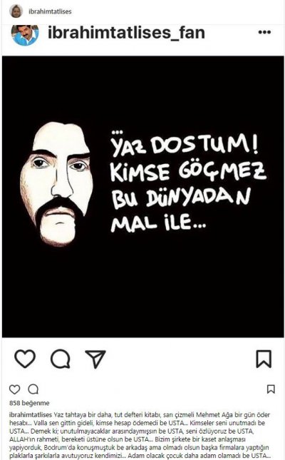 “Yaz tahtaya bir daha, tut defteri kitabı, sarı çizmeli Mehmet Ağa bir gün öder hesabı… Valla sen gittin gideli, kimse hesap ödemedi be USTA… Kimseler seni unutmadı be USTA… Demek ki; unutulmayacaklar arasındaymışsın be USTA, seni özlüyoruz be USTA, ALLAH’ın rahmeti, bereketi üstüne olsun be USTA…Bizim şirkete bir kaset anlaşması yapıyorduk, Bodrum’da konuşmuştuk be arkadaş ama olmadı olsun başka firmalara yaptığın plaklarla şarkılarla avutuyoruz kendimizi… Adam olacak çocuk daha adam olamadı be USTA…