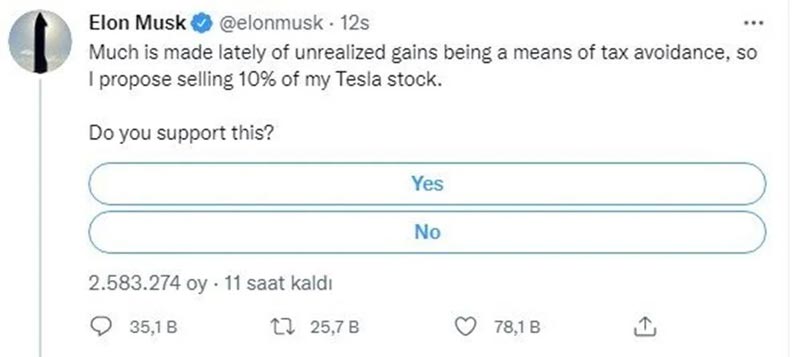 Musk 62 milyondan fazla takipçisine “Tesla hisselerimin yüzde 10’unu satmayı öneriyorum, destekliyor musunuz?” diye sordu.