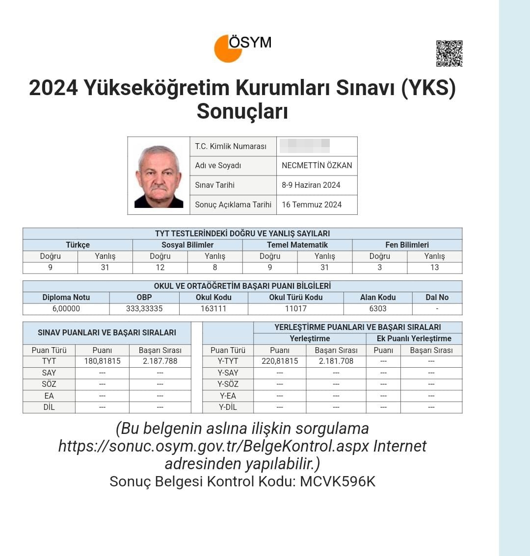 İnegöl’de yaşayan kasap Necmettin Özkan, torununa teşvik olmak amacıyla bu yıl YKS’nin ilk oturumu olan Temel Yeterlilik Testi’ne (TYT) girdi. Sonuçlar açıklanınca Özkan, yerleştirme puanıyla birlikte 220 puan aldı. Başarılı olduğu için büyük mutluluk yaşadığını söyleyen Özkan, sınava giren bir başka adayın önüne geçmemek için tercih yapmama kararı aldı.