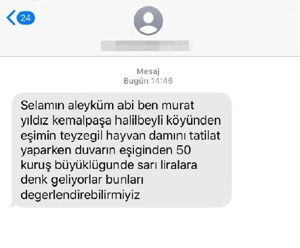 Mesajda, “Selamünaleyküm ağabey, ben Murat, İzmir’denim. Eşimin teyzesinin hayvan damını tadilat yaparken, duvarın içinde 50 kuruş büyüklüğünde sarı liralar bulundu. Bunları birlikte değerlendirebilir miyiz?” yazdığını gördü.