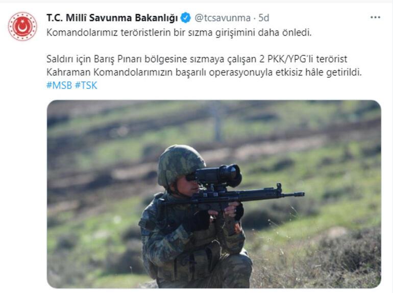 Bakanlıktan yapılan açıklamada, “Komandolarımız teröristlerin bir sızma girişimini daha önledi. Saldırı için Barış Pınarı bölgesine sızmaya çalışan 2 PKK/YPG’li terörist Kahraman Komandolarımızın başarılı operasyonuyla etkisiz hâle getirildi.”