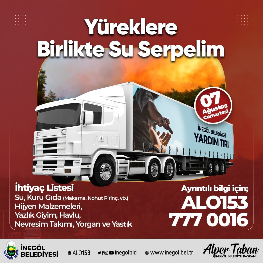 Bölgede yangınlar sebebiyle onlarca ev, yüzlerce hayvan telef oldu. Bölgedeki mağdur vatandaşlar ile söndürme çalışmalarına katılanlara destek amacıyla İnegöl Belediyesi “Yüreklere Birlikte Su Serpelim” sloganıyla yardım kampanyası başlattı. Başkan Alper Taban’n duyurduğu yardım kampanyasının 7 Ağustos’a kadar süreceği ve 7 Ağustos Cumartesi günü toplanan yardımların bölgeye sevk edileceği açıklandı. Alper Taban, konuya ilişkin açıklamasında şu ifadelere yer verdi: “Ülkemiz bir felaketle yüzleşiyor. Ciğerlerimiz, ormanlarımız yanıyor. Manavgat yangınların ilk başladığı nokta ve burada halen alevler yükseliyor. Bölgede çok ciddi kayıp var. Köyler, evler yok oldu. Bir ekibimizi söndürme çalışmalarına destek olması adına sevk ettik. Ancak yardım malzemesi noktasında da ihtiyaç var. Buna da sessiz kalamazdık. Karınca misali biz de vatandaşlarımızın destekleriyle bir yardım kampanyası başlatma kararı aldık.”