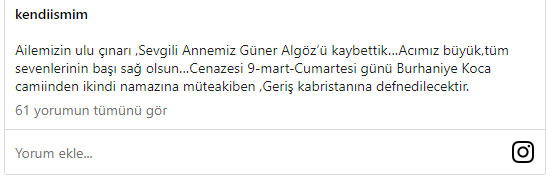 “Ailemizin ulu çınarı, sevgili Annemiz Güner Algöz’ü kaybettik. Acımız büyük, tüm sevenlerinin başı sağ olsun. Cenazesi 9 Mart Cumartesi günü Burhaniye Koca Camii’nden ikindi namazına müteakiben, Geriş Kabristanı’na defnedilecektir”