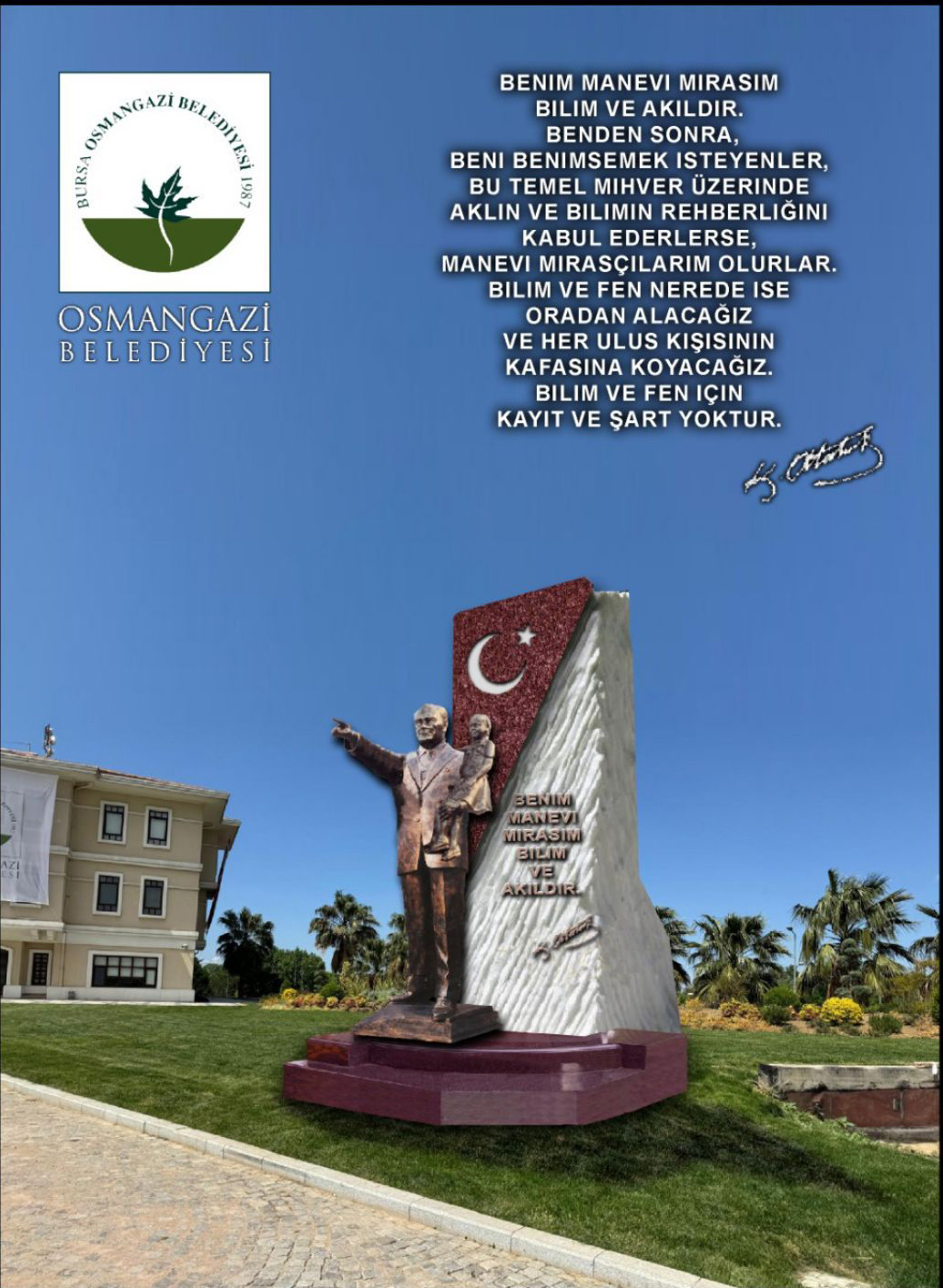 Osmangazi Belediyesi, 30 Ağustos Zafer Bayramı kutlamalarını, Osmangazi Belediyesi önüne dikeceği Atatürk Heykeli ile taçlandıracak. Atatürk’ün parmağıyla geleceği işaret ettiği ve geleceğin temsilcisi olan küçük bir kız çocuğunu kucağında tuttuğu heykel, 5 metre yüksekliğinde olacak. Heykelin üzerinde ise Atatürk’ün ‘Benim manevi mirasım bilim ve akıldır’ sözü yer alacak. Atatürk Heykeli, belediye binası girişinde yer alan Osman Gazi Heykeli’nin karşısına dikilecek. Bir tarafta Osmanlı Devleti’nin kurucusu olan Osman Gazi Heykeli, diğer tarafta ise Türkiye Cumhuriyeti’nin kurucusu Mustafa Kemal Atatürk’ün Heykeli, belediyeye gelen vatandaşları karşılayacak. Atatürk Heykeli, 30 Ağustos Cuma günü 18.00’da düzenlenen tören ile açılacak.